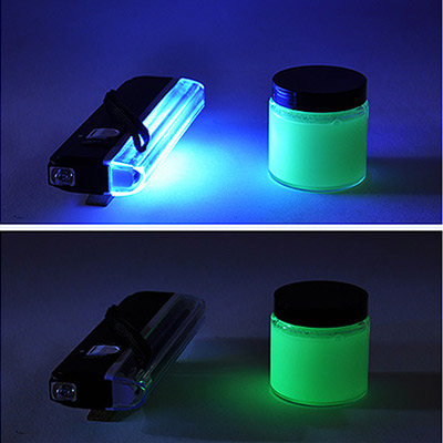 De hecho la pesca es uno de los muchos campos de aplicación para los productos fosforescentes (que brillan en la oscuridad): pintar el cebo u otras partes del equipo con la pintura fosforescente puede ser muy útil porque éste será visible durante la pesca nocturna. Y dado que el equipo se coloca a menudo en lugares oscuros donde la luz no llega, la lámpara portátil UV podría ser útil simplemente para cargar el pigmento luminescente cuando lo necesite. Además, la luz UV carga el pigmento fosforescente mucho más rápido que la luz del día normal y luz artificial.